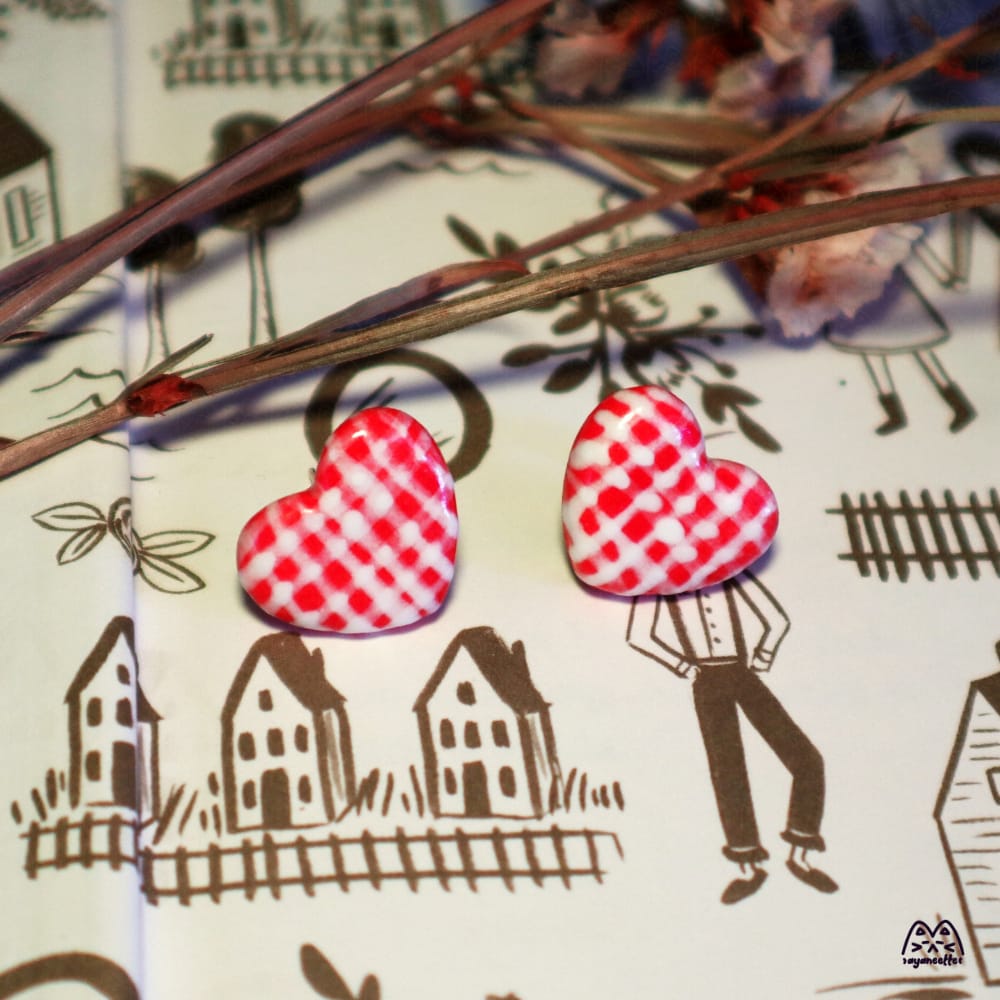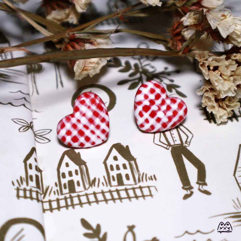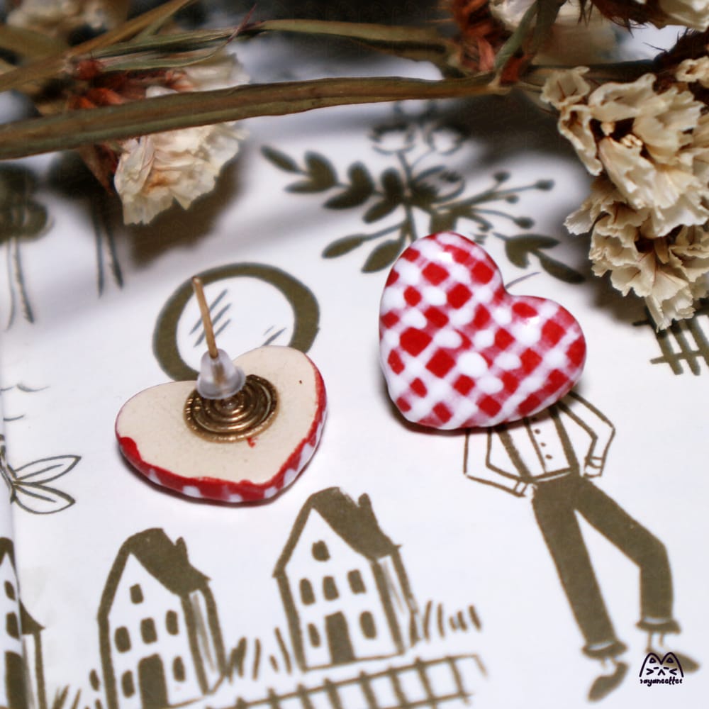 Los aretes Beatriz son pequeños aretes de poste de tumbaga, una aleación de oro y cobre con forma de corazón y estamado de cuadrícula como la tela mascota o gingham, son muy coquetos.