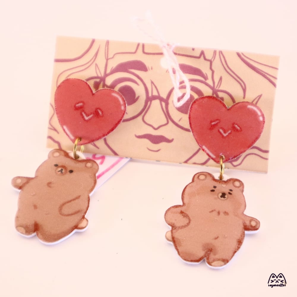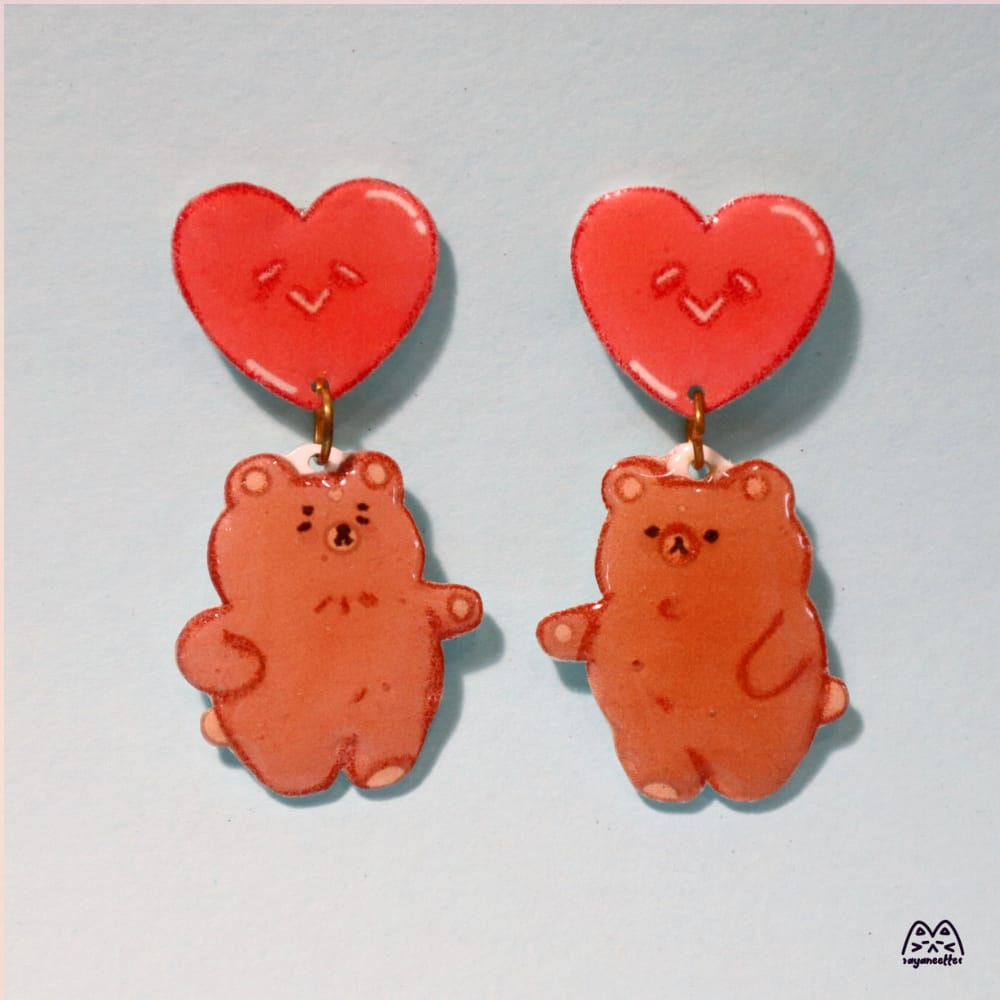 Estos aretes de amigos osos o amigosos fueron dibujados digitalmente en clip studio paint y una vez impresos fueron intervenidos con lápices de colores con mucho amor y son muy ligeros