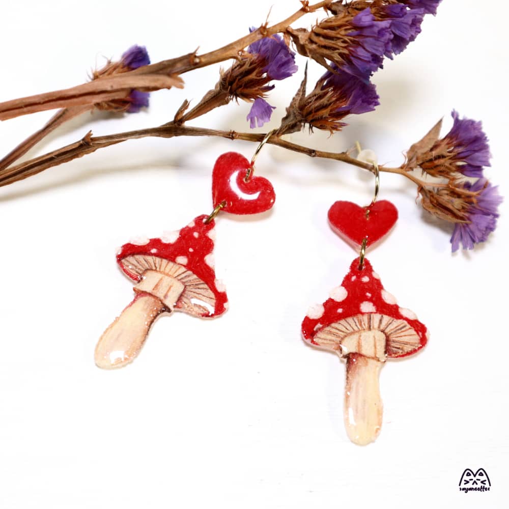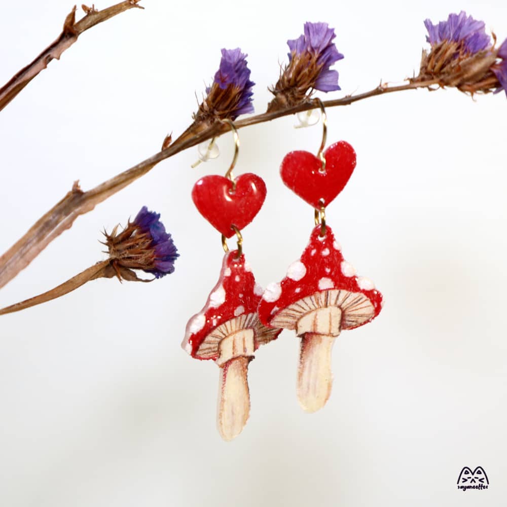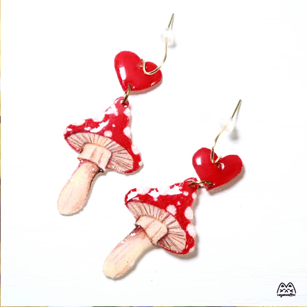 Estos aretes de honguito son dibujados a mano con mucho amor y son muy ligeros