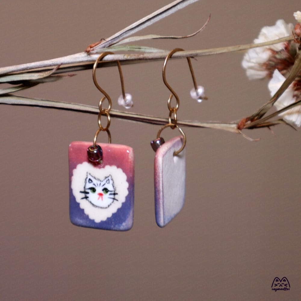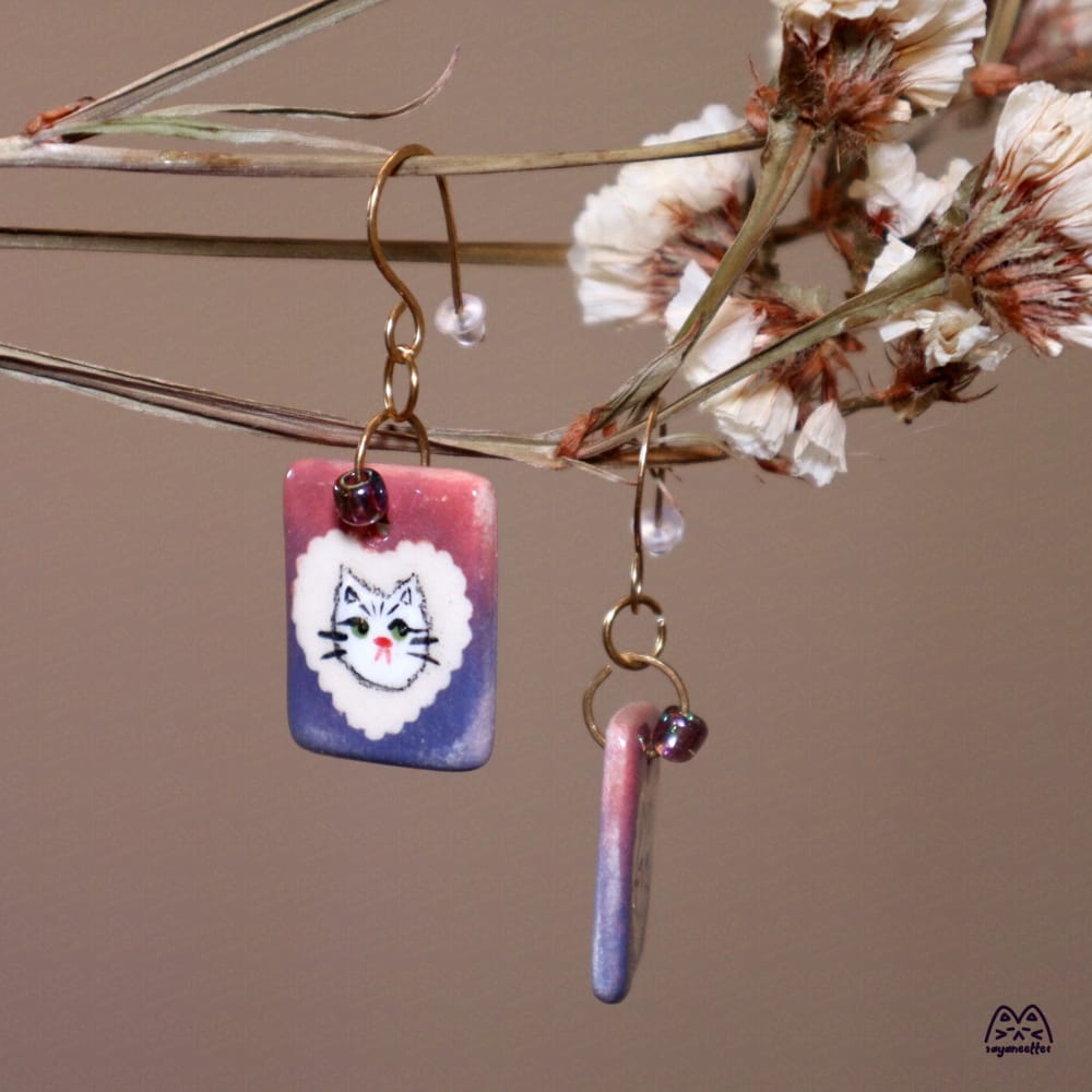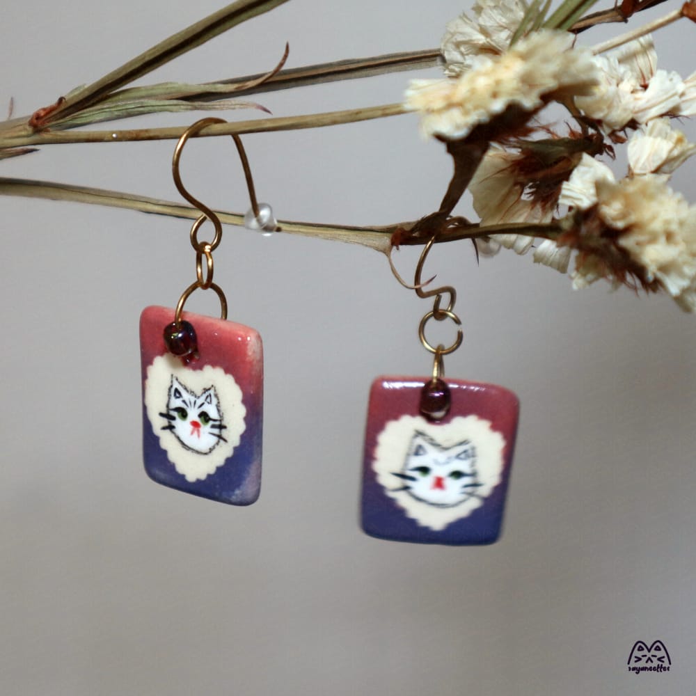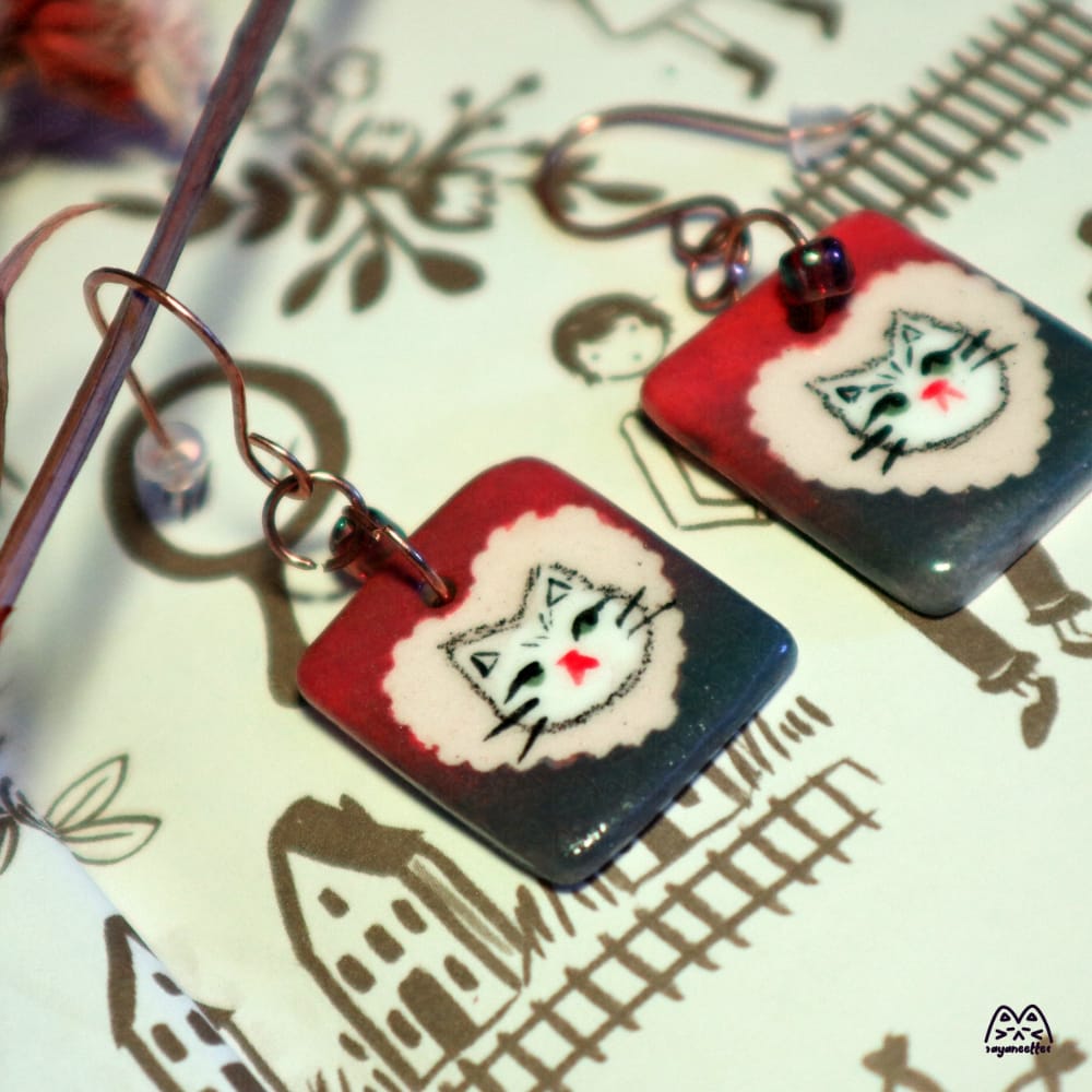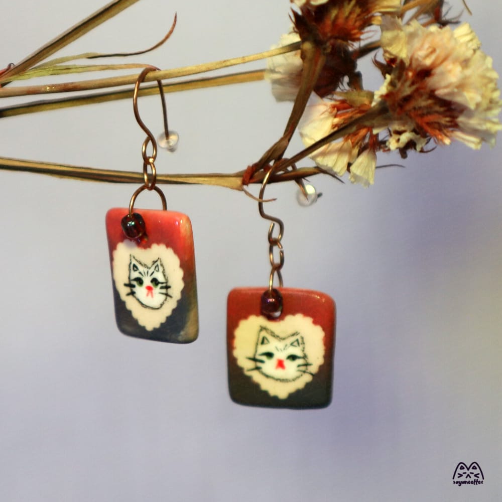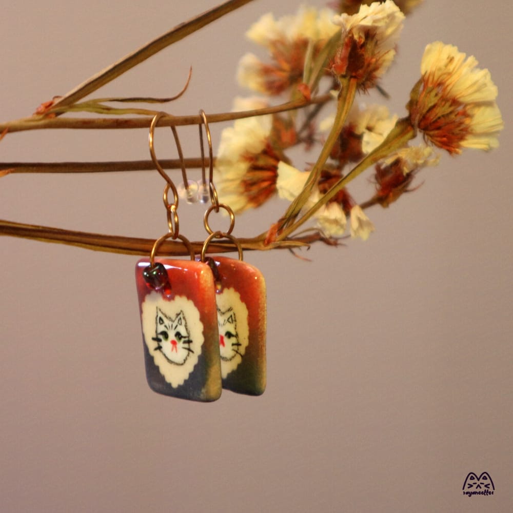 Aretes de gatito inspirados por los gatitos de cerámica vintage con un gancho elaborado a mano con tumbaga, una aleación de oro y cobre.
